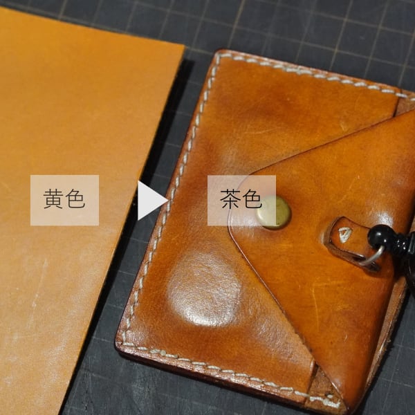 掲載写真では、左側が未使用の革で黄土色、右側が同一素材を約4年間使用したものです。