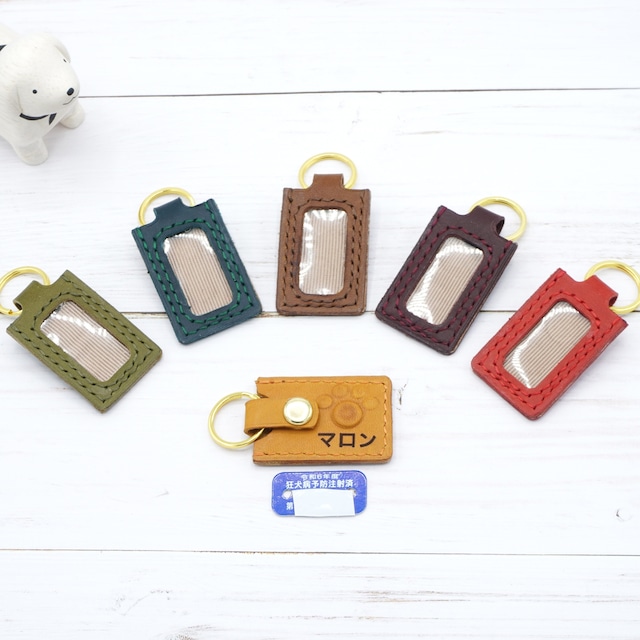 \無骨な狂犬病予防接種済の金属プレート(注射済票)を入れるケースです/ 裏側はかわいい肉球マークをつけています。 首輪やハーネスにとりつけられるリングもついています。 【名入れ】 オプションとなりますが、名入れもできます。 肉球マークの下のスペースに焼印で名前などをお入れいたします。 フォントサイズは4~6mmの大きさとなります(文字数によってサイズが変わります)。名入れするワンちゃんの名前、 もしくは飼い主様の名前や電話番号等をご連絡ください。 掲載画像にありますように、 * ひらがな・カタカナ・漢字: ゴシック体 or 明朝体 or 手書き風フォント * アルファベット: 筆記体 or 楷書体 or 手書き風フォント からお選びください。 最大10文字程度となり、フォントサイズは文字総数によって変動します。 【カラー】 選べる色は写真の9種類です。ご希望の色をオプション欄で指定してください。 * イエロー * レッド * オリーブ * ティールグリーン * モカ * ボルドー * グレージュ * ミッドナイトブルー * シルキーブラック 【革について】 イタリア、トスカーナ州にあるコンチェリア 800社でバケッタ製法により加工されているトスカーノリスシオという革を使用しています。バケッタ製法は、1000年近く受け継がれるイタリア伝統の製法で、天然の植物タンニンなめしでじっくりと時間をかけた革に、高純度の牛脚油をゆっくりと染み込ませていく、手間と愛情を込めた製法です。こうして生まれたレザーは、革の芯まで油脂成分が行き渡り、コシがありながらも滑らかで、手に吸い付くような独特の感触が特徴です。 市販でよく見られる合成レザーとは異なり、本革ならではのしっとりとした有機的な風合いがあり、上品な質感です。 使い込むほどに艶が増し、深い味わいへと変化していく経年変化(エイジング)も魅力の一つです。 前面カバー:プラスチック製クリアシート 糸:ナイロンの手縫い糸です。 【サイズ】 縦 約5cm(リング除く) 横 約3cm ※:縦15mm×横30mmサイズの注射済票プレートに対応しています。 自治体によってサイズが違いますのでご注意ください。 【カスタムオーダー承ります】 ・形状は本作品と同じ長方形型となりますが、他のサイズのケースも作製できますので遠慮なく、メッセージにて発行元自治体名と縦横サイズをお教えください。 【納期について】 受注後に作製いたしますので、ご入金いただいてから発送までは2日程度をいただいております。早く完成した場合は、予定日を待たずにすぐに発送致します。 【本革素材について】 本革は天然素材ですので細かな色むらや傷があることをご了承ください。 一つひとつ手作業で作成しますので、柄の位置等が多少異なる場合がございます。 エイジングといって、紫外線や手の脂の影響を受け、より深みのある色に経年変化します。 【お手入れについて】 軽度な傷であれば、指や布でこするだけで消すことができますが、革用クリームを使えばよりキレイに傷を消せることができます。 【糸のほつれやパーツの破損について】 糸がほつれた場合やパーツが外れた場合などは修繕致しますので、ご連絡ください。 キーワード:狂犬病予防接種、接種札入れ、接種札ケース、かわいい、おしゃれ