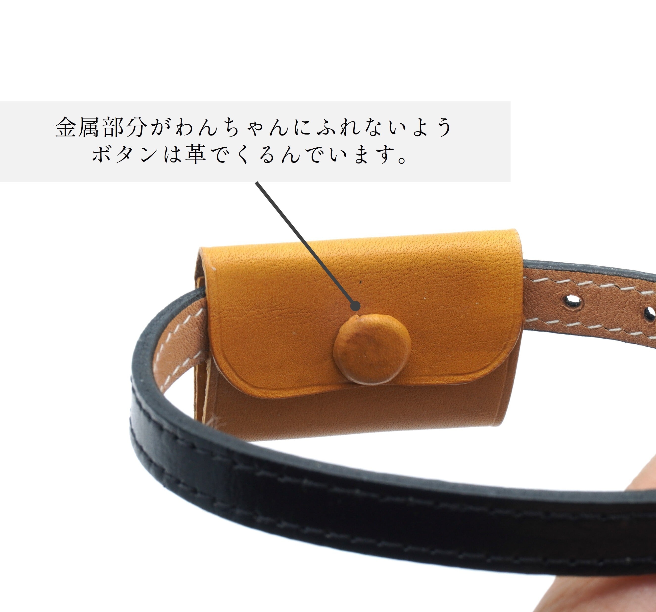 ・ボタンの金属がワンちゃんに触れないように革で包んでいます(くるみボタン)