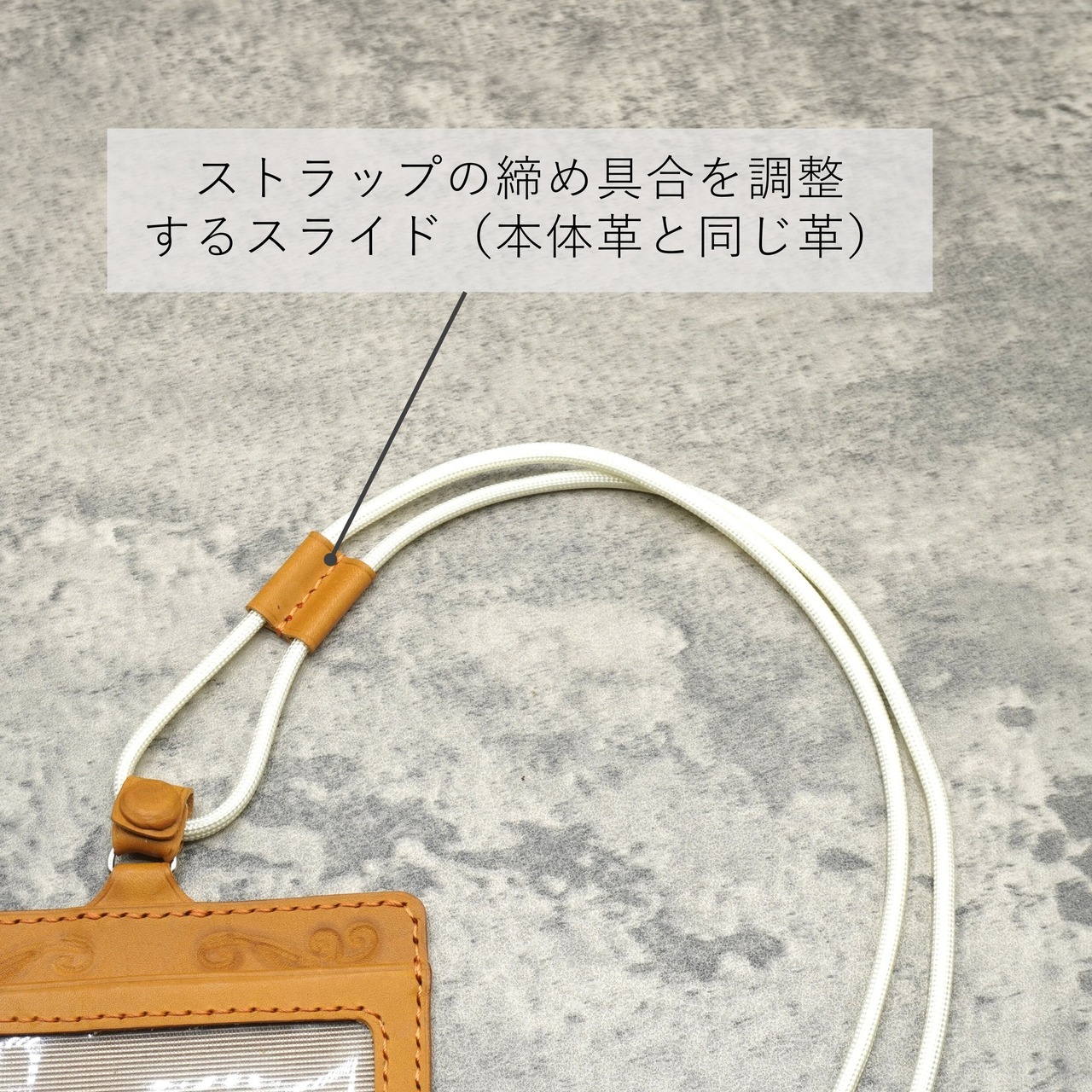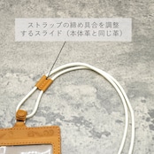 ストラップの締め具合を調整できるスライド(IDカード本体と同じ革となります)もついています。