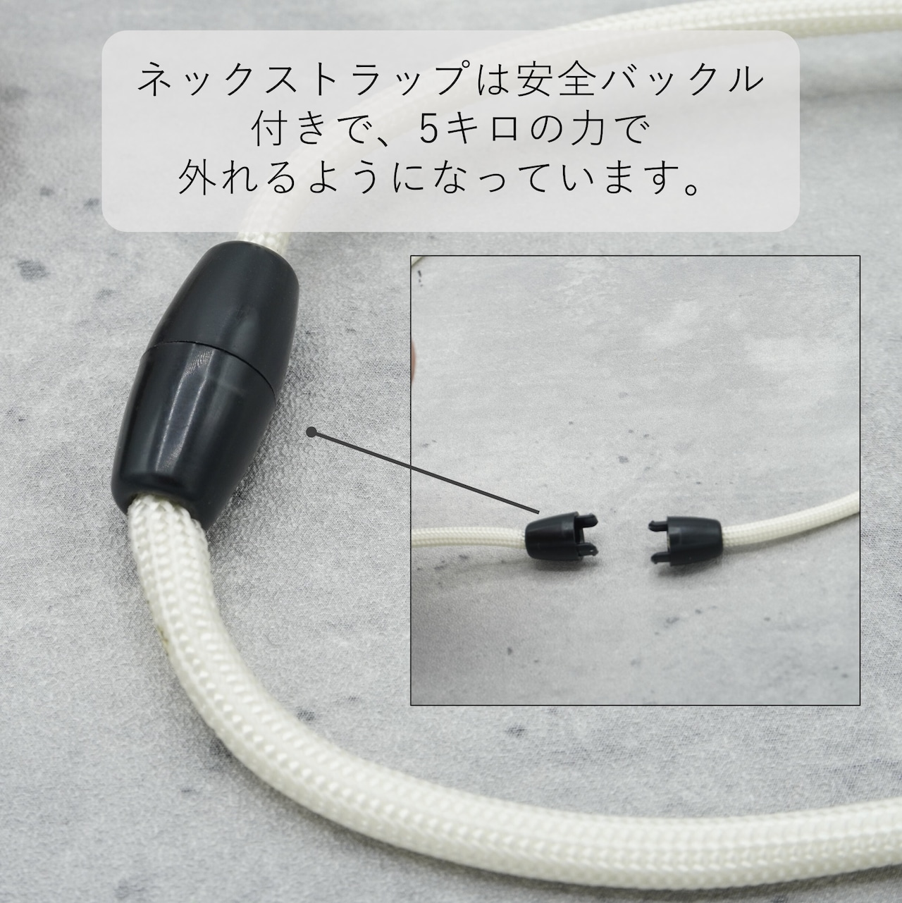 その他の特長:力が加わると外れる安全バックル付きです。